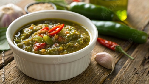 Sambal Ijo Green Chili Paste in White Bowl with Rustic Table Setting suitable for Asian Cuisine
