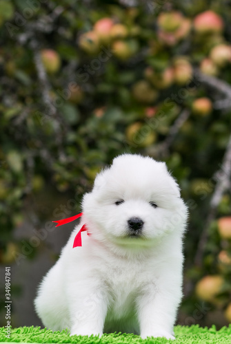 Samoyed puppy posing outside. Beautiful white dog in green background.