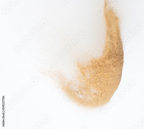 Sand flying explosion, Golden sand wave explode. Abstract sands cloud fly. Yellow colored sand splash throwing in Air. White background Isolated high speed shutter, throwing freeze stop motion
