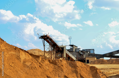 Sand making plant in mining quarry. Crushing factory with production line for crushing, grinding stone, sorting sand and bulk materials. Sand washing for the construction industry
