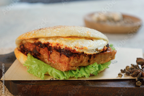 Sandwich with fried egg and vegetables on a wooden cutting board