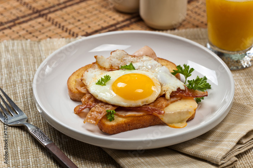 Sandwich with fried eggs - Croque Madame. Selective focus.