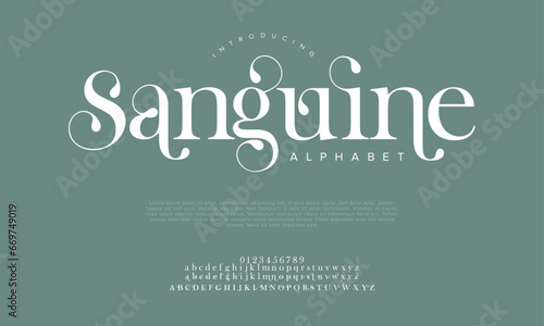 Sanguline premium luxury elegant alphabet letters and numbers. Elegant wedding typography classic serif font decorative vintage retro. Creative vector illustration