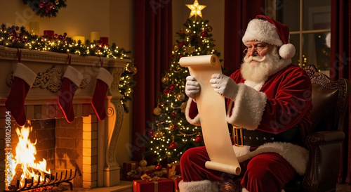 Santa Claus checking list by cozy fireplace on Christmas Eve, reading names on scroll. Santa Claus checking list ensures everyone gets right gifts, bringing holiday cheer.