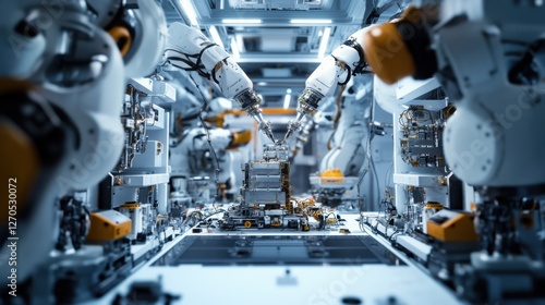 Satellite assembly in an aerospace facility. Featuring robotic arms and complex satellite modules