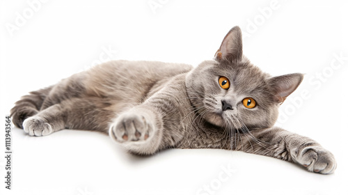 Satisfied British Cat: A British cat lying on a white background with a raised paw, suitable for advertising or playful pet imagery.