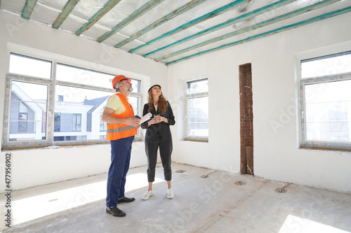 caucasian, woman, female, engineer, construction, men at work, builder, man, male, room, ceiling, look, stare, drawing, helmet, architect, build, work, hard hat, vest, indoor, site, cup, hold, designer, civil, design, designing, house, safety, building, hot drink, inside, orange, blueprint, development, project