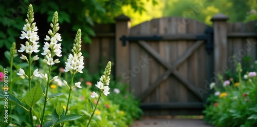 Saururus cernuus stems with white flowers against a wooden gate and fence, garden, gate, flowers