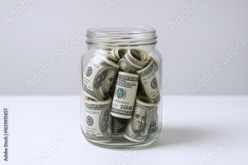 Savings Concept: Glass Jar Filled with Rolled United States One Hundred Dollar Bills