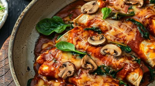 Savor our spicy red sauce vegan enchiladas stuffed with sauted spinach and mushrooms for a perfect plantbased delight.