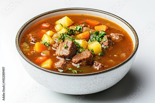 Savor the rich flavors of beef stew filled with vegetables in a stylish bowl