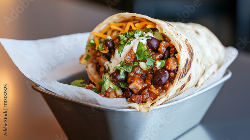 Savory breakfast burrito with beans, cheese, and cilantro in metal tray