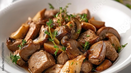 Savory meat dish with tender mushrooms and fresh herbs beautifully arranged in a white bowl, perfect for culinary inspiration and gourmet dining.