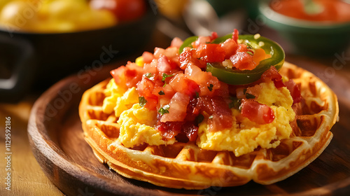 waffle, taco, breakfast, egg, bacon, cheese, salsa, savoury, delicious, unique, favor, satisfying, crispy, spicey, ingredient, meal, cookery, comfort, snack, receipe, garnish, epicure, brunch, taste, deliciously, hearty