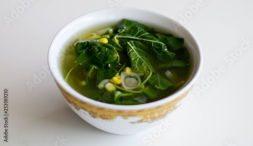Sayur Bening Bayam or Spinach Clear Soup on white background. Boiled spinach with corn. Indonesian food.