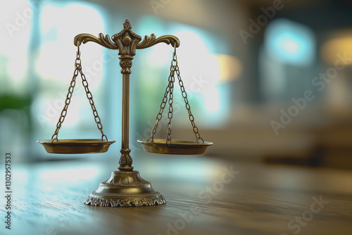 Scale of justice symbol on wooden table representing law and legal system concepts in a professional setting