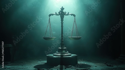 Scales of justice glowing in a dark courtroom, spotlight effect, symbol of balance