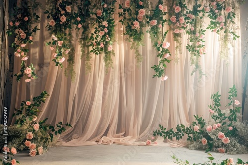 Scandi-Boho style muted olive studio backdrop with a matte finish, cream curtains with minimalist patterns, adorned with clusters of soft pink roses and trailing ivy, with light fog haze and spotlight