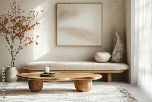Scandinavian composition with mock up poster frame, round beige coffee table, wooden bench, decoration, bright sculpture and personal accessories. Stylish and minimalist home decor, Generative AI
