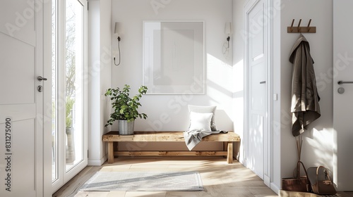 Scandinavian entryway with clean lines, wooden bench, natural light, and simple decor