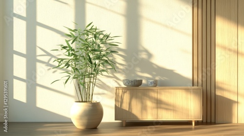 scandinavian, living, room, light, wood, cabinet, potted, bamboo, plant, ceramic, decor, hardwood, floor, white, wall, vertical, paneling, sunlight, casting, shadow, rendering, japanese, zen, influence