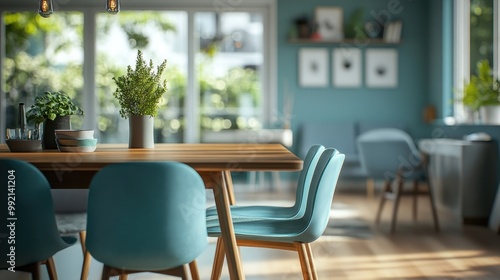 Scandinavian, mid-century style home interior design of modern dining room with wooden dining table and turquoise chairs