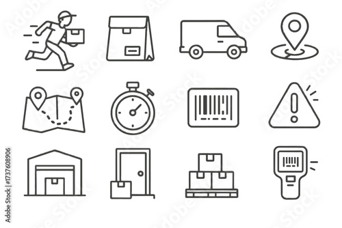 vector, icon, stopwatch, device, scanning, label, notification, tracker, pallet, global positioning system, client, courier, alert, warehouse, parcel, bag, dock, stack, running, barcode, route, doorstep, map, delivery, van, line, collection, symbol, stroke, contour, set, outline, minimal