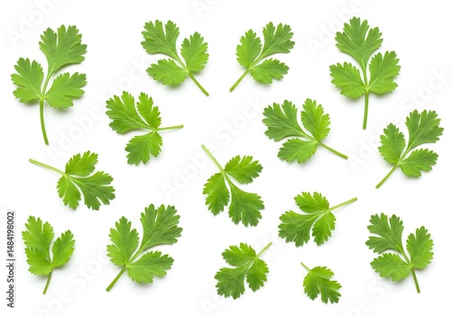 Scattered coriander leaves on a white background for culinary use