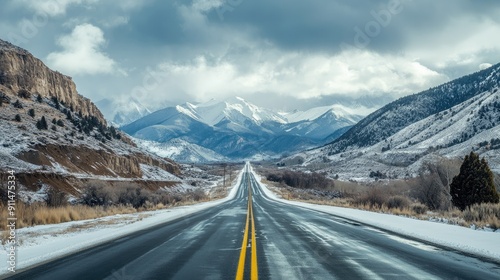 Scenic asphalt highway heading into the snowy mountains with cloudy skies, perfect for adventure themes.