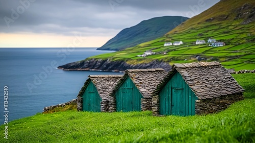 Scenic coastal landscape with traditional stone cottages wild atlantic way nature photography overcast sky serene ambiance