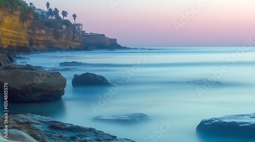 Scenic Coastal Sunset with Calm Waves and Rocky Cliffs for Serene Landscape Photography : Generative AI