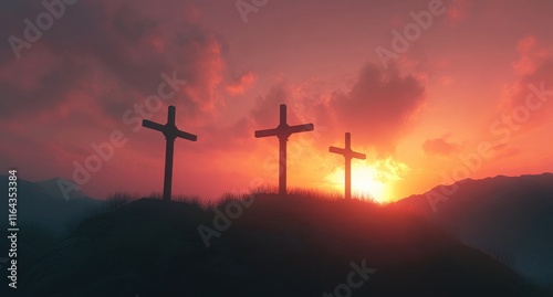 Scenic Dawn with Silhouette of Three Wooden Crosses Against a Colorful Sky and Mountainous Horizon, Symbolizing Faith and Hope in Nature's Beauty