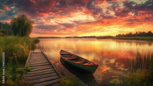 Scenic lake landscape with an old wooden bridge, a row boat, and a vibrant sky at dusk.