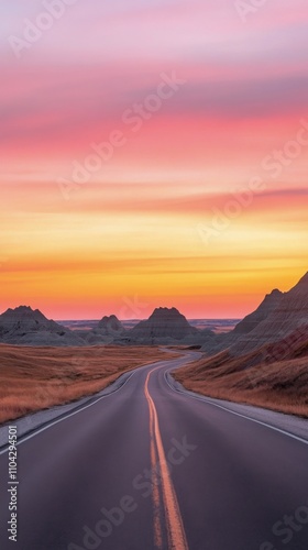 Scenic road winding through the badlands at sunset with vibrant sky colors
