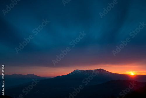 mountain, sunset, sun, sunlight, sunshine, sky, cloud, heaven, dramatic, dusk, evening, background, fog, hazy, peak, summit, vale, mount, range, skyline, silhouette, backlight, dark, darkness, night, blue, orange, light, landscape, view, nature, outdoors, beauty, scenery, scenic, travel, wilderness, majestic, dawn, sunrise, shadow, bright, magnificence, colourful, weather, storm cloud, overcast, anxiety, crimea, no people