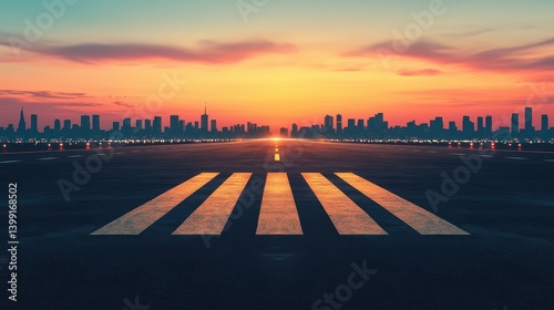 Scenic Sunset Over Urban Skyline with Airport Runway Markings and Dramatic Colorful Clouds