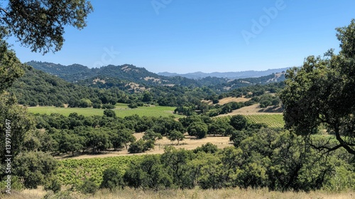 Scenic valley view from hillside with vineyards, farmland, and mountains. Possible use real estate, tourism, agriculture