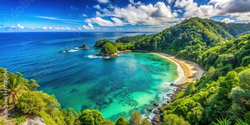 Scenic view of a coastline with lush forest and clear blue ocean , landscape, coastline, forest, ocean, water, trees