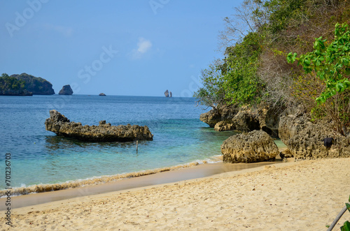 beach, sea, ocean, coast, coastline, shore, sand, sandy, rock, rocky, water, clear, turquoise, blue, sky, cloud, island, island, vegetation, green, tree, plant, foliage, tropical, landscape, seascape, nature, outdoors, scenic, view, summer, vacation, holiday, travel, tour tourism, paradise, tranquil, serene, calm, peaceful, idylli, beauty, sunlight, sunshine, day, bright, horizon