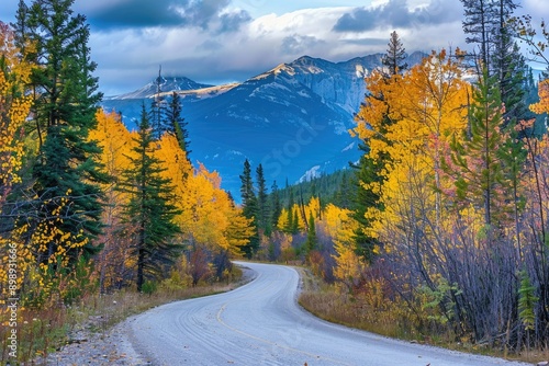 Scenic view of a winding dirt road surrounded by tall trees and majestic mountains, perfect for outdoor adventure or nature scene