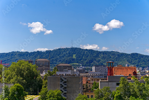 Scenic view of skyline of Swiss City of Zürich with skyscrapers and local mountain Uetliberg in the background on a sunny hot summer day. Photo taken July 20th, 2023, Zurich, Switzerland.