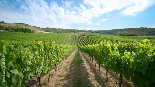 Scenic Vineyard Landscape Under Blue Sky and Fluffy Clouds : Generative AI