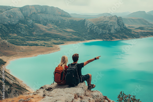 mountain, lake, couple, view, travel, scenic, exploration, adventure, panorama, landscape, tour tourism, vacation, nature, outdoors, hiking, backpacking, journey, cliff, vista, turquoise, water, lover, together, holiday, destination, wanderlust, recreation, leisure, beautiful, picturesque, breathtaking, stunning, point of view, gesture, guide, pointing, orientation