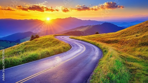 road, sunset, mountain, hill, landscape, nature, scenic, view, travel, adventure, journey, summer, sun, sky, cloud, green, grass, field, curve, path, way, asphalt, horizon, colours, beauty, picturesque, tranquil, serene, peaceful, calm, bright, vibrant, majestic, awe, inspiring, freedom, open, huge, rural, wilderness, discovery