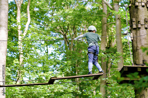 School boy in forest adventure park. Acitve child, kid in helmet climbs on high rope trail. Agility skills and climbing outdoor amusement center for children. Outdoors activity for kid and families.