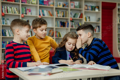school children in the library reading books, doing homework, prepare a school project for lessons