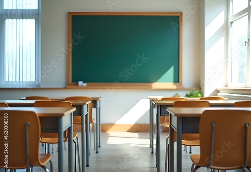 school classroom with desks and chairs, large chalkboard hanging on wall, big windows with curtains, concept of back to school learning and education