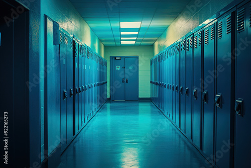School Hallway with Blue and Teal Lockers in a Cinematic Perspective, Featuring Warm Light and Clean Modern Design in a Wide-Angle View.