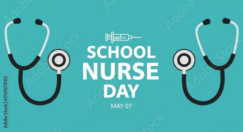 School Nurse Day stethoscopes syringe on teal background