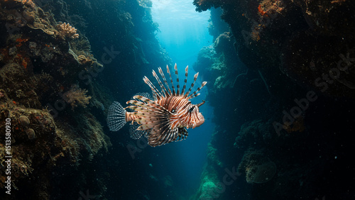 School of tropical fish and a colorful lionfish swim among coral reefs in the deep blue ocean